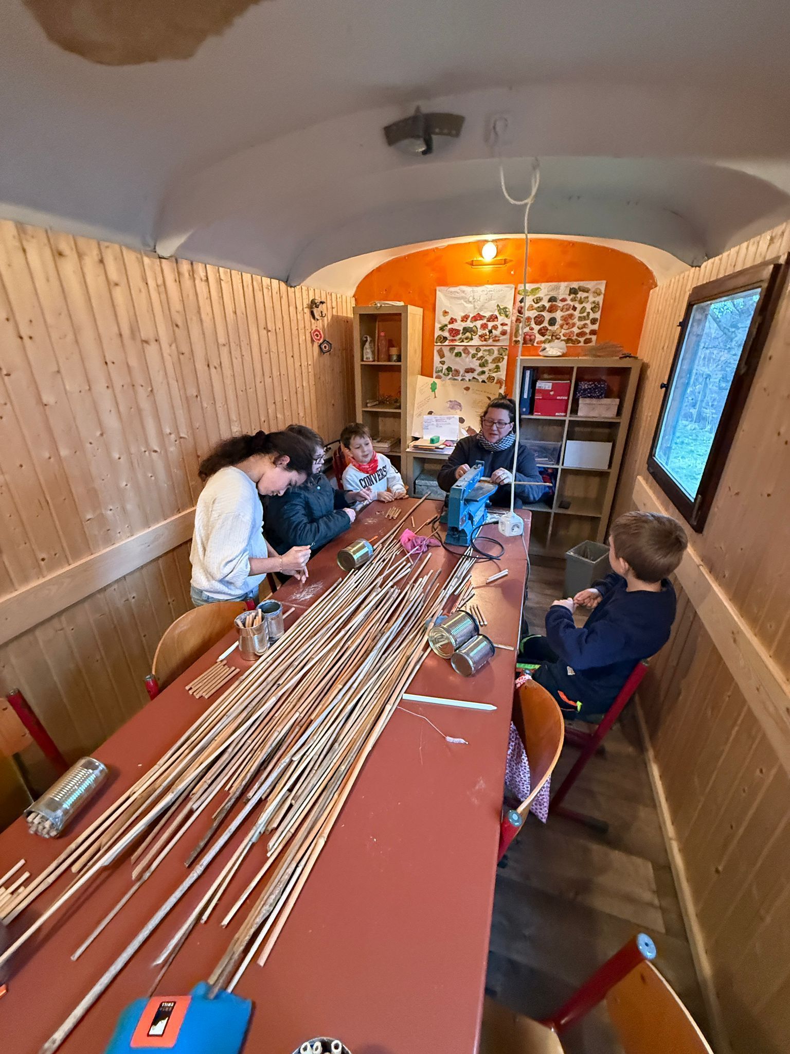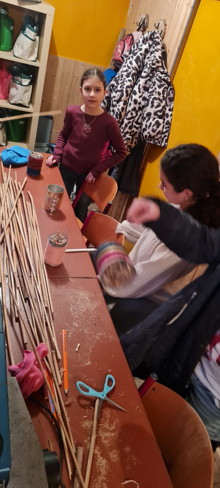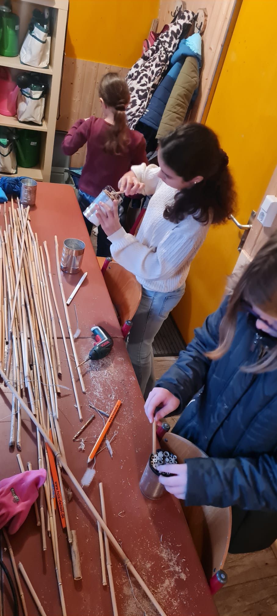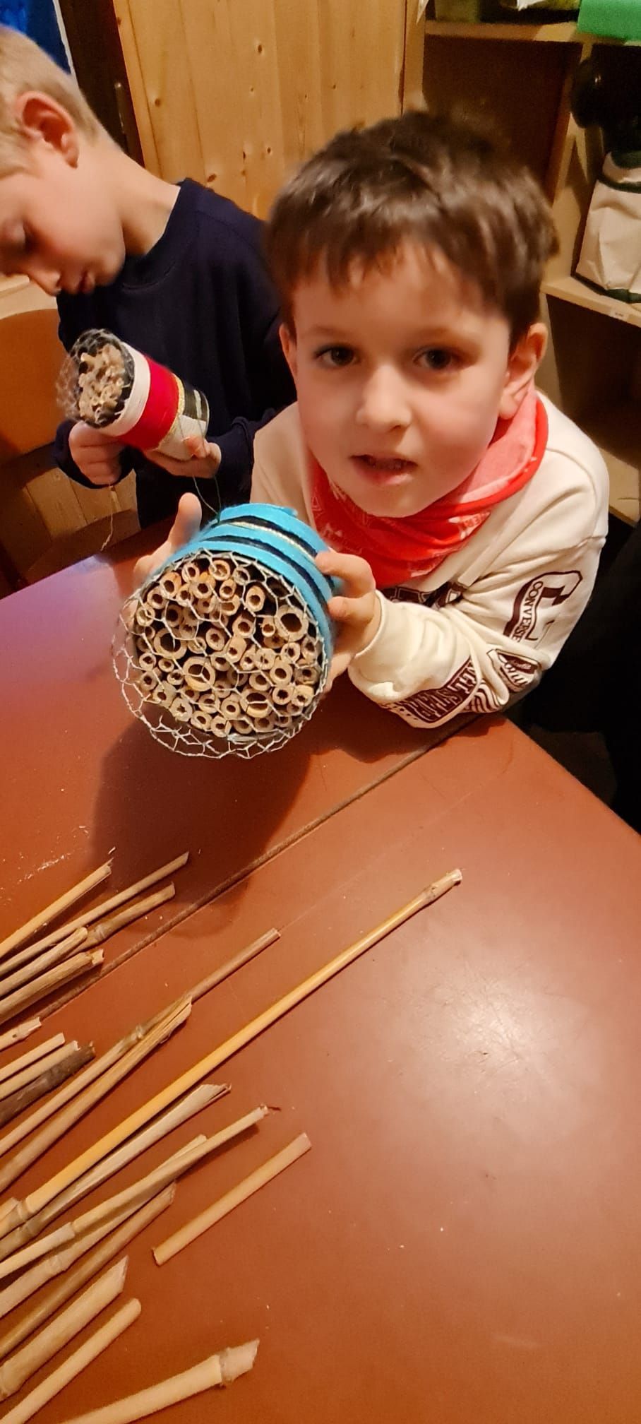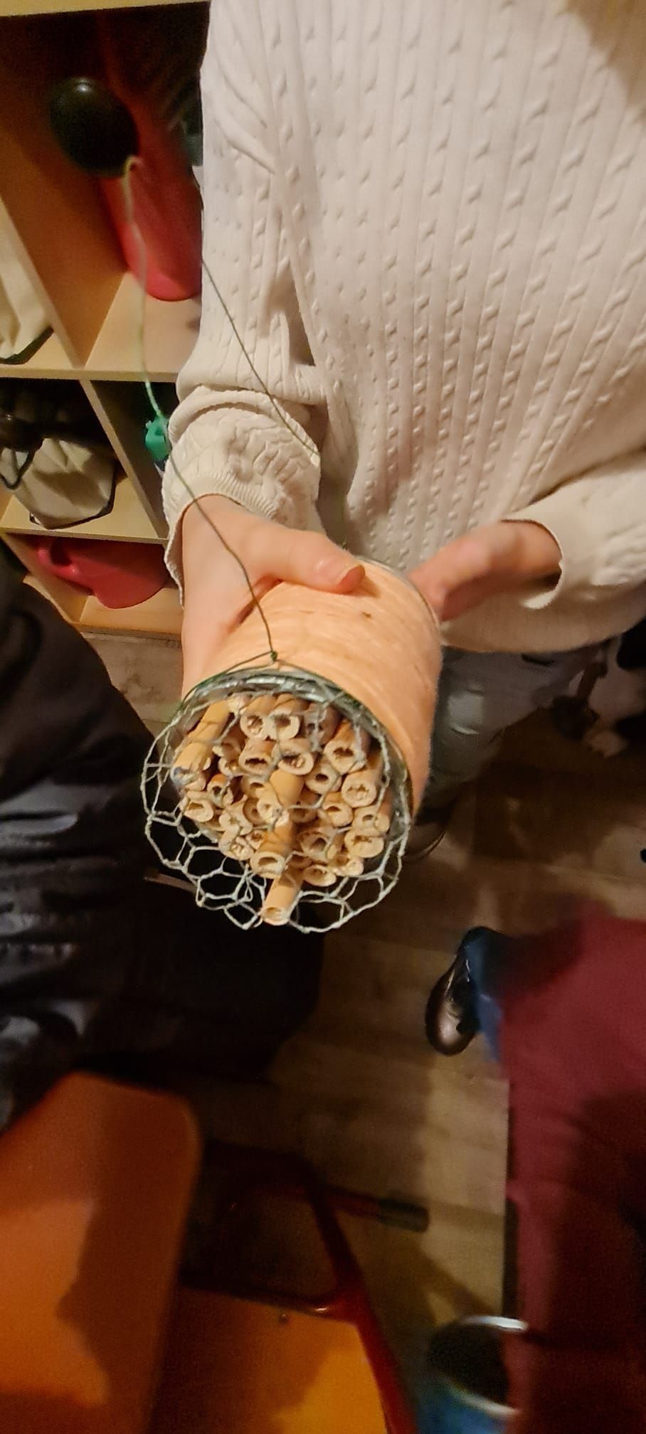 Wir haben Insektenhotels gebastelt. Zuerst mussten wir Schilfröhrchen auf die richtige Länge anzeichnen. Natascha hat die dann mir der Dekupiersäge zugeschnitten und zusammen mit Miri haben wir sie dann mit kleinen Bürstchen ausgeputzt, damit sich die Wildbienen nicht an den Flügeln verletzen. Alle Röhrchen haben wir dann ganz fest in die Dosen gestellt und zwar so eng, dass keine mehr rausfallen. Natascha hat dann noch Hasendraht zugeschnitten, den wir außen anbringen mussten und mit Klebeband fixieren. Das ist nötig, dass Vögel die Röhrchen nicht rausziehen können und die Brut der Wildbienen vespern.