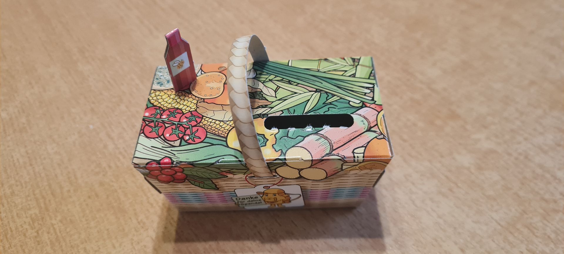 Nach einer kurzen Snack-Pause haben wir aus Pappe noch ein kleines Spardöschen in Form eines Obstkörbchens gebastelt, das jedes Kind mit nach Hause nehmen konnte.