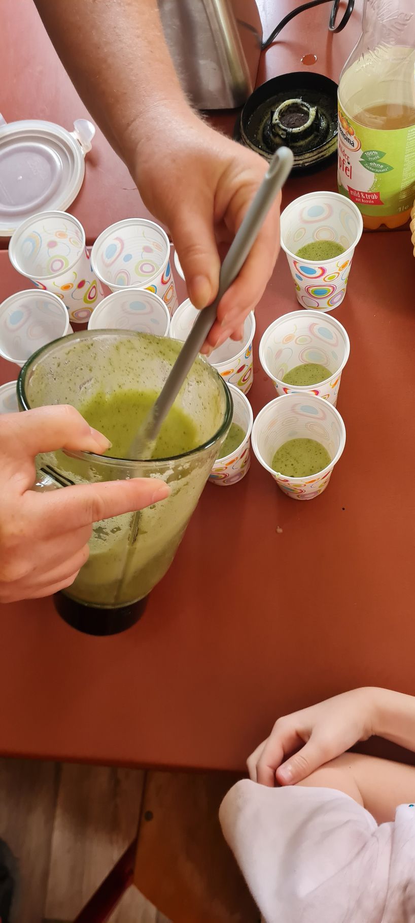 Mit Apfelsaft, 1 Banane, 1 Handvoll Brennnesseln und einem Spritzer Zitrone wurde alles in den Mixer gegeben und gemixt. Jeder durfte und wollte auch probieren. Aber erst mussten Yvonne und ich trinken, als Vorkoster ;-) Aber dann.... alle fanden ihn lecker und einige der Kinder wollten sogar nochmal einen haben.