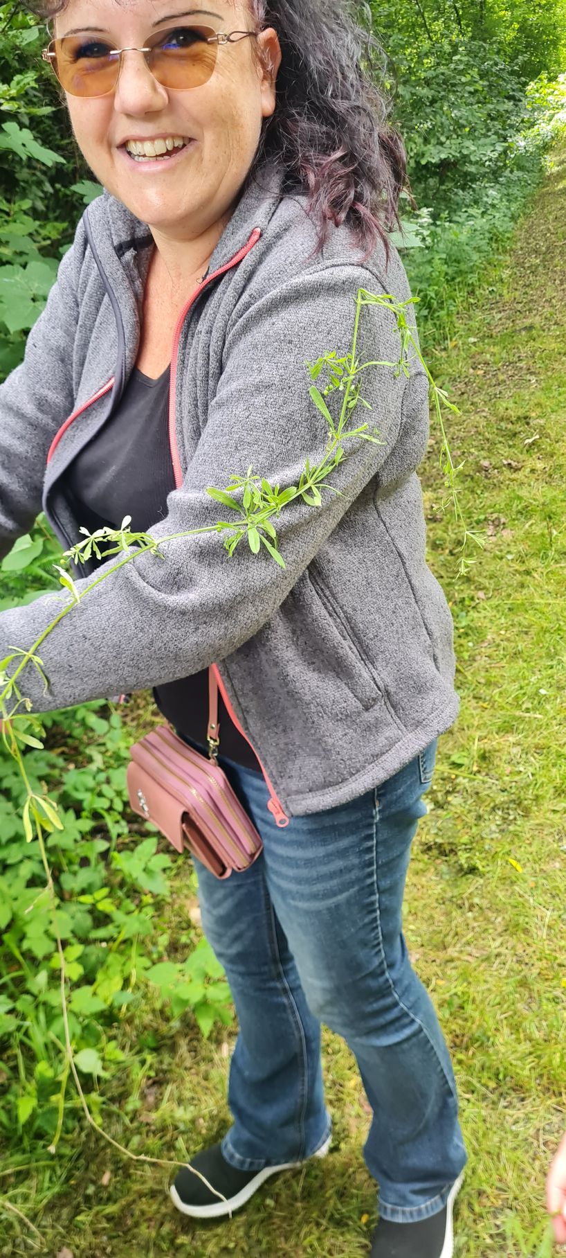 Nun wollte uns Natascha noch einen umgestürtzten Baum zeigen, damit wir auch mal die Wurzeln sehen können. Auf dem Weg dahin, hat Natascha Kletten entdeckt. Sie hat uns gefragt, ob jemand weiß was das ist. Keiner wusste es! Und weil Natascha immer Blödsinn im Kopf hat, hat sie jedem einen Strang der Klette an den Pullover oder die Weste geklebt. Sogar Toni hat was abgekriegt. Hihi. Und weils so lustig war, hat jeder dann seine Klette auf Yvonne geklebt. Weil wir aber am Schluß noch zu einer Überraschung gehen wollten, hat Yvonne gesagt, wir müssen sie erst "entkletten", sonst gibts keine Überraschung. Na gut...