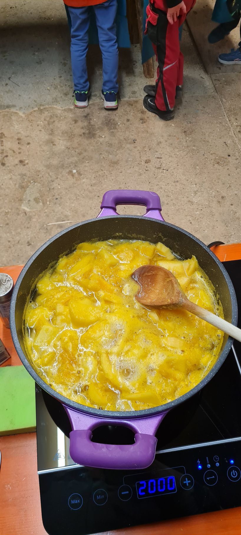 Natascha hat Ihre Kochplatte geholt und einen grooooßen Topf und dann haben wir Kürbissuppe gemacht. Lea hat 2 Kartoffeln für die Suppe geschält und die anderen Kinder haben das Fruchtfleisch von den Resten abgeschnitten. Yvonne und noch andere Kinder haben die Kerne vom Fruchtfleisch befreit und in eine separate Schüssel getan. Die werden getrocknet und Yvonne bringt sie dann wieder zum Naschen mit.
