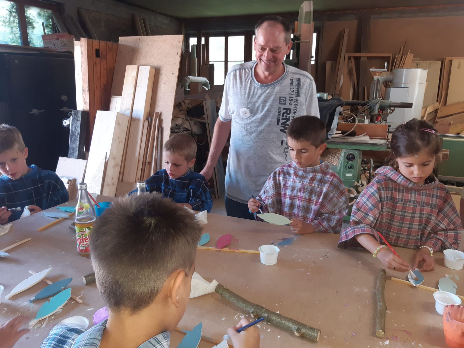 Wir haben den Kinder erst gezeigt, wie man mit einer Laubsäge die Holzfedern aussägt. War gar nicht so einfach mit den Kleinen zu sägen. Aber alle haben es geschafft. Nun sollten sie Ihre Federn glattschleifen und dann mit dem Handbohrer Löcher für die Fäden bohren. Gesagt, getan. Danach mussten die Äste noch mit Löchern versehen werden. Hier haben die Kinder an der Ständerbohrmaschine mit Michael die Löcher gebohrt. Jeder Ast brauchte ja 10 Löcher. 5 für die Klangstäbe, 3 für die Federn und 2 für die Aufhängung.